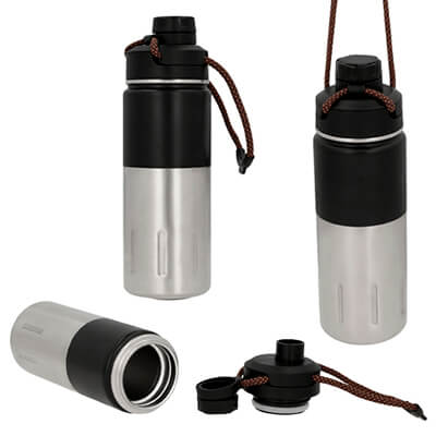 Termo insulado al vacío con doble pared de acero inoxidable. Incluye tapa y boquilla enroscables, además de una cuerda para mejor agarre. Medidas: 23.5 alto x 7.5 ancho
