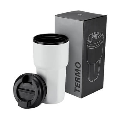 Doble pared. Pared interna plástico, pared externa acero inoxidable. Base de termo con forma hexagonal. Tapa de plástico con boquilla y sobre tapa de cierre a presión. Terminado mate. Incluye caja individual. Medidas: 6.5 x 18 cm
