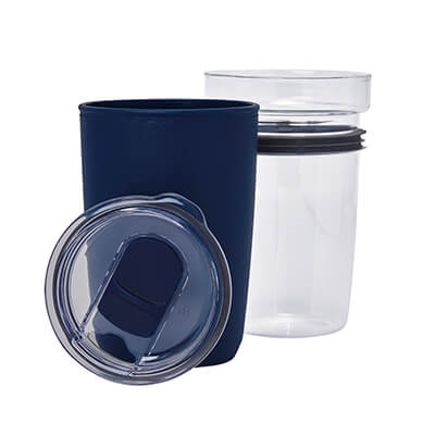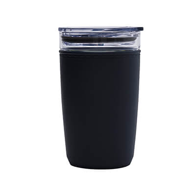 Termo doble pared. Interior de vidrio y exterior de plástico reciclado. Resistente a bebidas calientes y frías. Tapa de plástico con válvula de seguridad. Incluye caja individual. Medidas: 9.2 x 15 cm