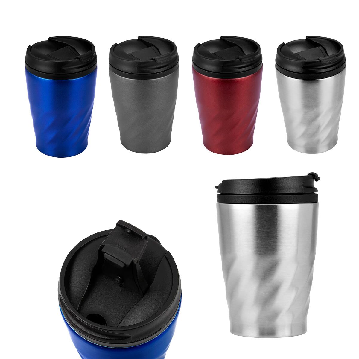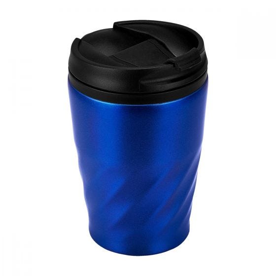 Doble pared. Pared interna plástico, pared externa acero inoxidable. Tapa de plástico con válvula de seguridad. Incluye caja individual. Medidas: 8 x 12.5 cm