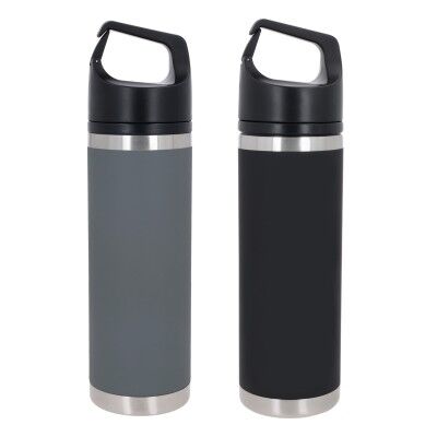 Termo con acabado rubber, doble pared de acero inoxidable, insulado al vacío, con boquilla remobible y tapa de rosca con asa tipo arnés. Medidas: 27.3 alto x 7.3 ancho