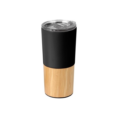 Termo de acero inoxidable doble pared con detalle en bambú, tapa plástica deslizable, fabricado en materiales de grado alimenticio, mantiene bebidas frías o calientes por un largo tiempo. No usar en microondas. Capacidad de 600 ml. Incluye caja de cartón individual. Medidas: 18.5x8.8 cm.
