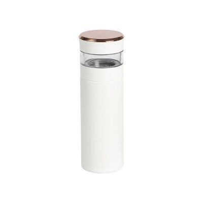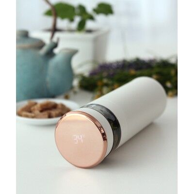 Termo de acero inoxidable doble pared con display de temperatura en la tapa, sección para infusiones con rejilla coladora, fabricada en materiales de grado alimenticio, mantiene bebidas frías o calientes por un largo tiempo. No usar en microondas. Capacidad de 400 ml. Incluye caja de cartón individual. Medidas: 16.5x6.5 cm.