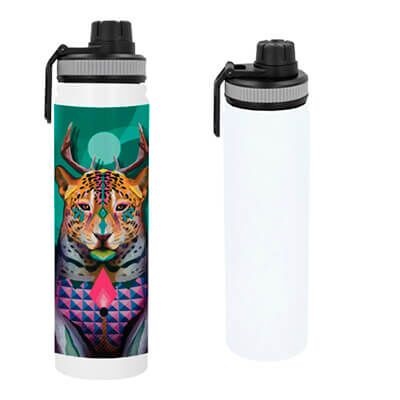 Termo sublimable de acero inoxidable y doble pared insulado al vacío. Cuenta con tapa de rosca con asa de plástico para sujetarlo fácilmente. Medidas: 27.5 alto x 7.5 ancho