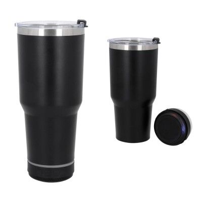 Termo con doble pared de acero inoxidable, insulado al vacío que cuenta con bocina bluetooth con controles de volumen, botón de reproducción, efectos de luz y micrófono para contestador de llamadas. Incluye cable tipo C. (La bocina es removible de la base del termo). Medidas: 23.8 alto x 10 ancho