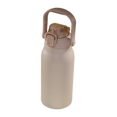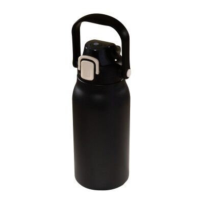 Doble pared. Cerrado al vacío. Pared interna y externa de acero inoxidable. Terminado rugoso. Tapa de plástico con sistema de rosca. Sobretapa con cierre push y seguro antiderrame. Asa plegable incluida. Mantiene temperatura caliente hasta 6 hrs y temperatura fría hasta 12 hrs. Caja individual incluida. Medidas: 10.5 x 27.5 cm