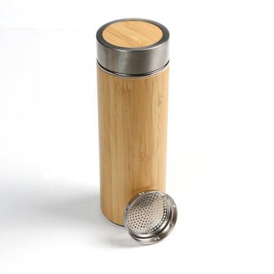 Termo doble pared fabricado en acero inoxidable con cubierta de bambú, tapa metálica de rosca y rejilla metálica para té. Mantiene tus bebidas frías o calientes por largo tiempo. Capacidad de 500 ml. Medidas: 21x7 cm.