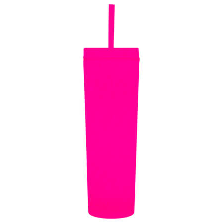 Termo de plástico con doble pared, tapa enroscable y acabado rubber. Incluye popote de plástico. Medidas: 21.5 alto x 7.2 ancho