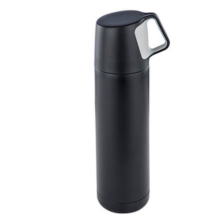 Termo con doble pared de acero inoxidable y tapa que funciona como taza. Medidas: 20.5 alto x 8.5 ancho