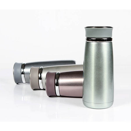 Termo de acero inoxidable doble pared con acabado brillante y detalles metálicos, fabricado en materiales de grado alimenticio, mantiene bebidas frías o calientes por un largo tiempo, no usar en microondas. Capacidad de 420 ml (14 oz). Incluye caja de cartón individual. Medidas: 18x7 cm.