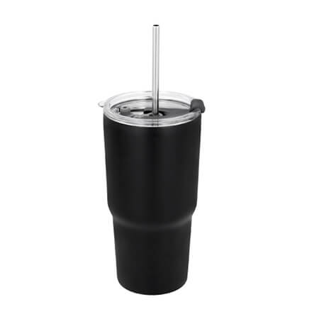 Termo con doble pared de acero inoxidable con tapa traslúcida y cierre a presión, boquilla de seguridad de plástico, boquilla de silicón cubre popote y popote metálico incluido. Medidas: 16.8 alto x 8.7 ancho