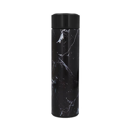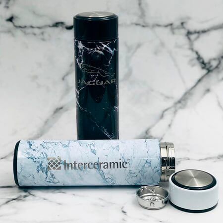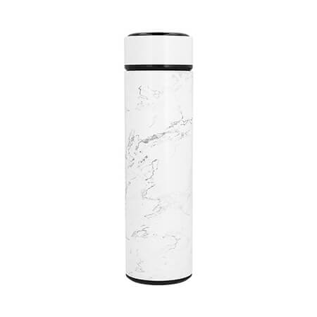 Termo con doble pared de acero inoxidable con acabado tipo mármol. Incluye colador. Medidas: 23 alto x 6.5 ancho