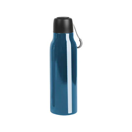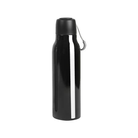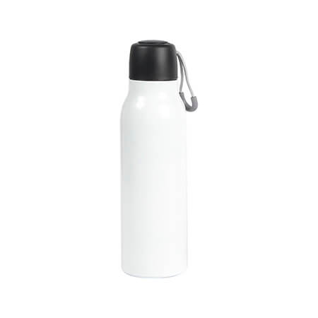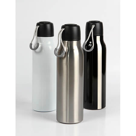 Termo de acero inoxidable doble pared acabado brillante, con tapa de plástico y correa textil. Fabricado en materiales de grado alimenticio, mantiene bebidas frías o calientes por un largo tiempo. No usar en microondas. Capacidad de 500 ml. Incluye caja de cartón individual. Medidas: 25.5x6.5 cm.
