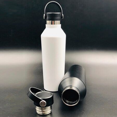 Termo con doble pared de acero inoxidable con tapa enroscable, asa de plástico y textura en el cuerpo. Medidas: 29 alto x 7 ancho