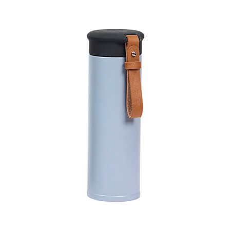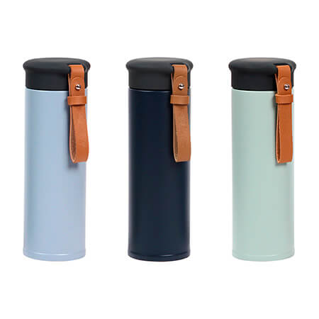 Termo de acero inoxidable con doble pared, tapa de Acrilonitrilo Butadieno Estireno (ABS), rejilla para té y correa de piel. Fabricado en materiales de grado alimenticio, mantiene bebidas frías o calientes por un largo tiempo, no usar en microondas. Capacidad 450 ml. Incluye caja de cartón individual. Medidas: 20.5x6.5 cm.