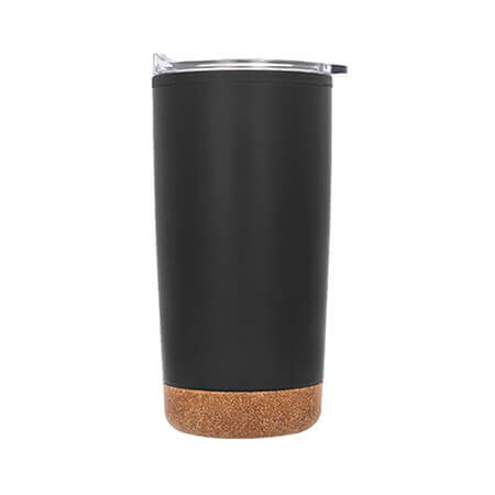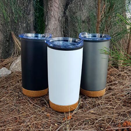 Termo con doble pared de acero inoxidable e interior de plástico, base de corcho, tapa traslúcida a presión con seguro deslizable y boquilla. Medidas: 17.5 alto x 8.5 ancho