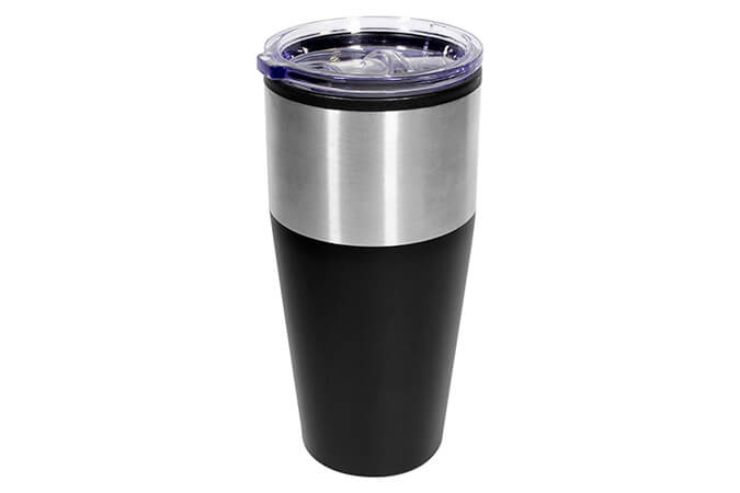 Plástico y acero inoxidable. Doble pared. Interior: polipropileno (PP) y exterior acero inoxidable 201 con detalles de color. Tapa transparente que cierra y abre deslizandose.