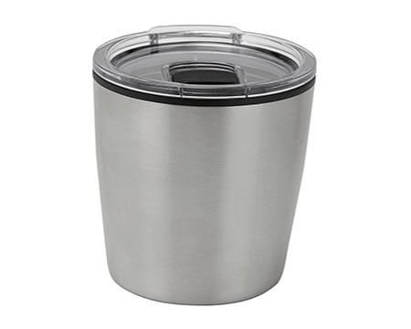 Doble pared. Pared interna plástico, pared externa acero inoxidable. Tapa de plástico con válvula de seguridad. Incluye caja individual. Medidas: 6.9 x 9.5 cm