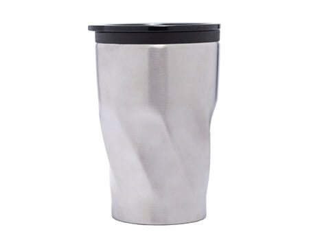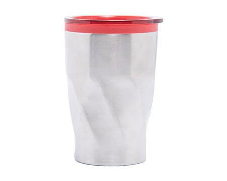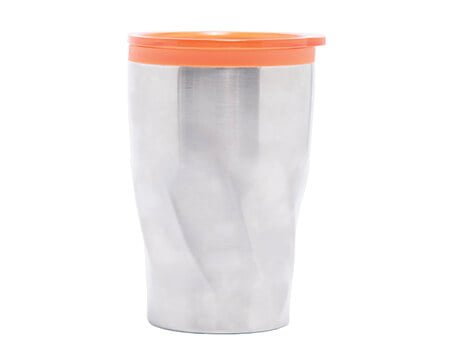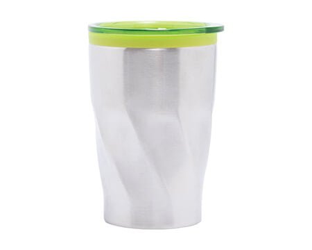 Termo de acero inoxidable con interior de plástico. Cuenta con tapa de cierre a presión y seguro deslizable al color del interior. Diseño poligonal. CAP. 350 ml. Medidas: Ø 8.3 x 13 cm
