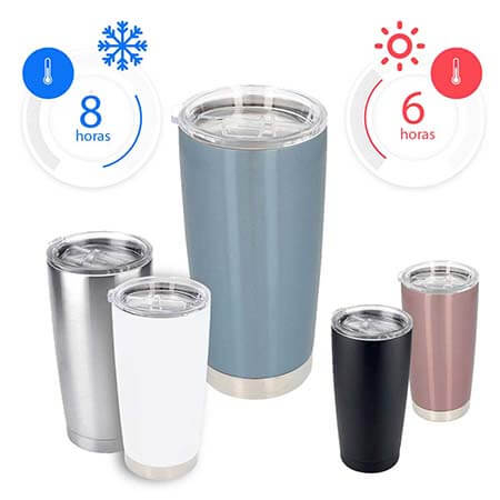 Doble pared. Cerrado al vacío. Pared interna y externa de acero inoxidable. Incluye tapa de plástico con válvula de seguridad. Mantiene temperatura caliente 6 hrs y temperatura fría 8 hrs aproximadamente. Incluye caja individual. Medidas: 8.7 x 17.7 cm