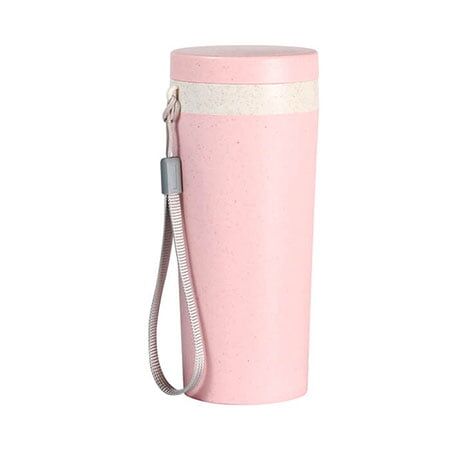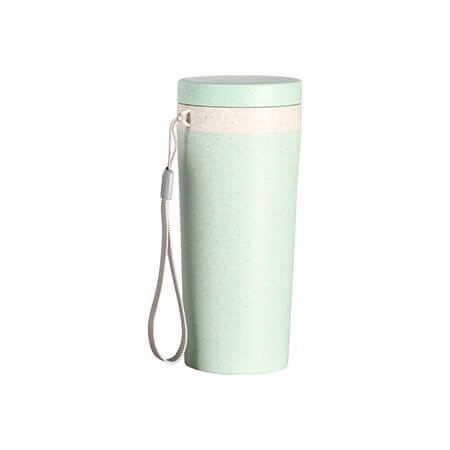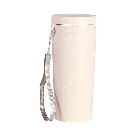 Termo doble pared fabricado en material Ecológico (Fibra de Trigo) con tapa de polipropileno con correa para fácil transportación. Capacidad de 300 ml. Producto biodegradable. Medidas: 17x7 cm.