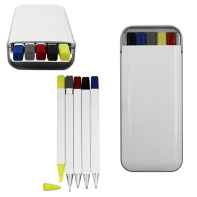 Set de escritura de plástico con asa que sirve como base que contiene: 3 bolígrafos de color (negro, rojo y azul), 1 lapicero y 1 marcatextos verde. Medidas: 13 alto x 5.5 ancho