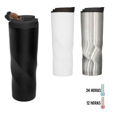Termo con doble pared de acero inoxidable, tapa de plástico enroscable y boquilla de seguridad. Medidas: 22.5 alto x 7.7 ancho