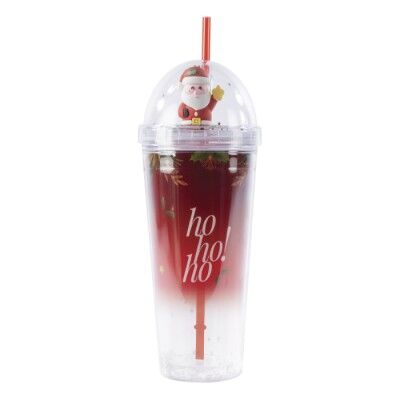 Vaso de plástico de doble pared con diseño navideño y lentejuelas en su interior. Cuenta con tapa de cúpula con figura de Santa Klaus con lentejuelas y popote. CAP. 500 ml. Presentación: caja de regalo de color. BPA FREE. Medidas: Ø 10 x 20 cm