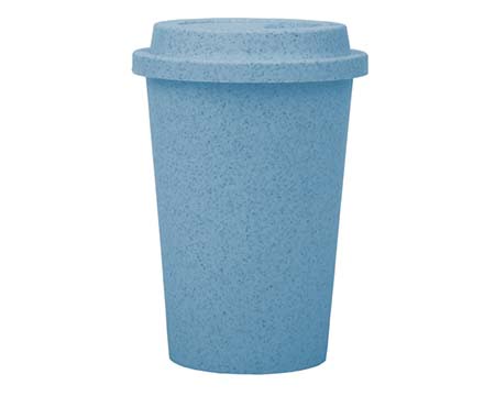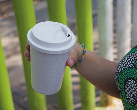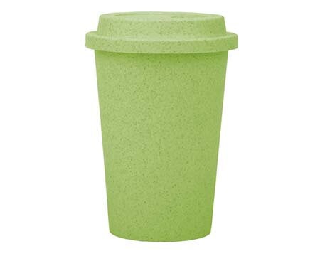 Vaso ecológico a base de fibra de trigo para bebidas calientes. Con tapa de rosca anti derrames. CAP 11 OZ. Medidas: Ø 9.2 x 13.3 cm