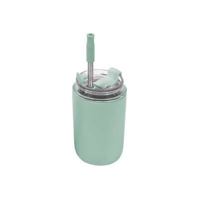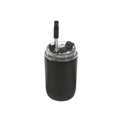 Vaso de acero inoxidable doble pared con tapa de plástico deslizable y popote de metal con detalle de silicón en la parte superior. Fabricado en materiales de grado alimenticio, mantiene bebidas frías o calientes por un largo tiempo. No usar en microondas. Capacidad 300 ml. Incluye caja de cartón individual. Medidas: 12.5x7.7 cm.