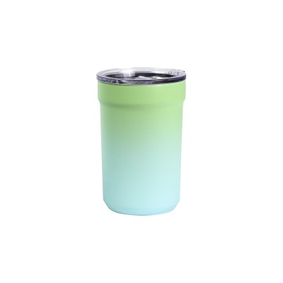Vaso térmico fabricado en acero inoxidable doble pared. Capacidad de 14 oz. Incluye tapa transparente. Diseño en colores degradados. Medidas: 13.5x8.5 cm.