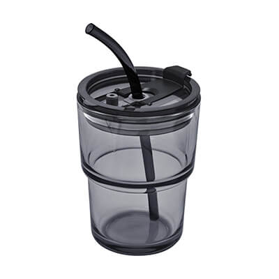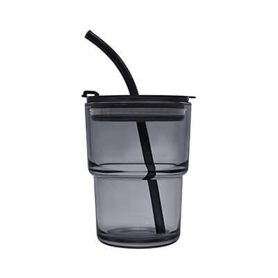 Vaso de vidrio de una pared. Tapa y sobre tapa de plástico con sistema push y ranura especial de silicón con tapón para popote. Incluye popote de plástico. Caja individual incluida. Medidas: 8.9 x 12.8 cm