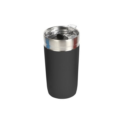 Vaso de acero inoxidable doble pared con tapa de plástico transparente deslizable. Fabricado en materiales de grado alimenticio, mantiene bebidas frías o calientes por un largo tiempo. No usar en microondas. Capacidad 473 ml. Incluye caja de cartón individual. Medidas: 15.9x8.6 cm.