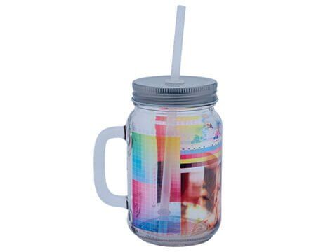 Tarro de vidrio con asa para sublimación, tapa de rosca metálica en color plata y popote. CAP. 475 ml. (16 OZ). Temperatura y Tiempo sugeridos para sublimar: 210 grados / 210 seg. Medidas: Ø 8 x 13 cm