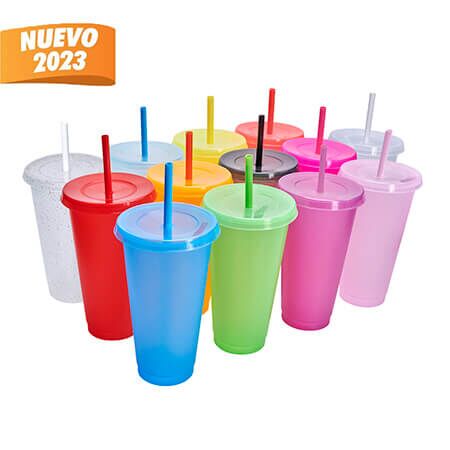Vaso de plástico con tapa push y popote. Capacidad 27 oz. Base de 6.4 cm de diámetro. Medidas: 10.8 cm x 18 cm