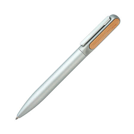 Bolígrafo con barril de aluminio acabado mate y detalle superior en bambú. Tinta de escritura negra. Incluye caja de cartón individual con apariencia bambú. Medidas: 14x1.2 cm.