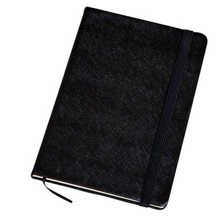 Libreta con pasta texturizada de apariencia metálica, separador y banda elástica para sujetar cubierta. Con 90 hojas rayadas. Medidas: 21 alto x 14 ancho