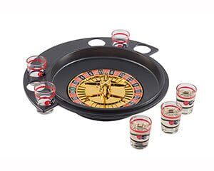 Juego de ruleta de la suerte, con tapete de fieltro con numeros impresos que coinciden con los de la ruleta. Para dos a seis jugadores, ontiene 6 caballitos con numeros impresos para indicar castigos y 2 bolas para ruleta. Medida de vasos: 4.8 cm. CAP. 1/2 OZ.
